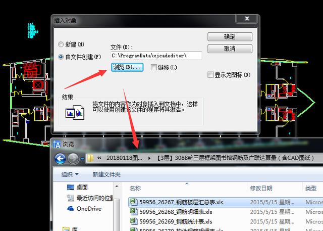 3.在插入对象窗口,选择【由文件创建】,点击浏览,在浏览窗口找到并点击需要插入的Excel表格。