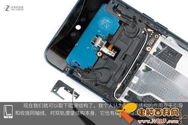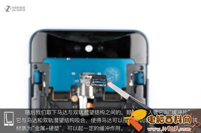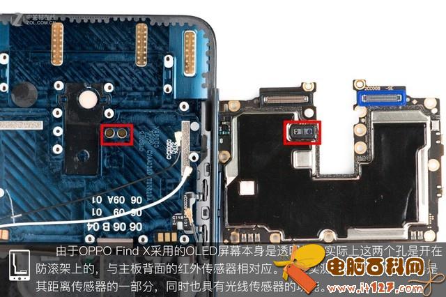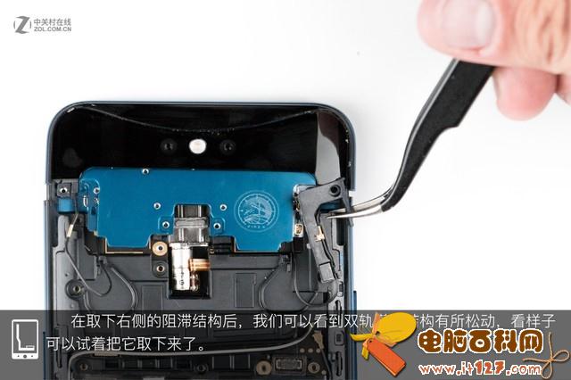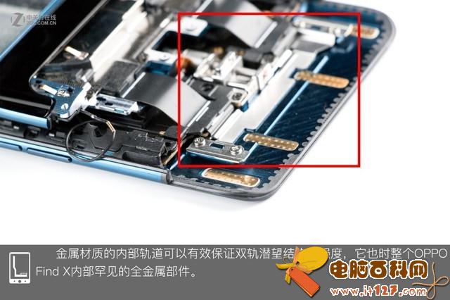 在经过试触后,我们觉得背壳与跻身之间应该没有排线相连,毕竟没有指纹传感器,于是轻轻的将背壳掀开。掀开背壳,我们可以看到OPPO Find X的内部结构依然是常见的三段式结构,红框内的部分应该就是双轨潜望结构了。
