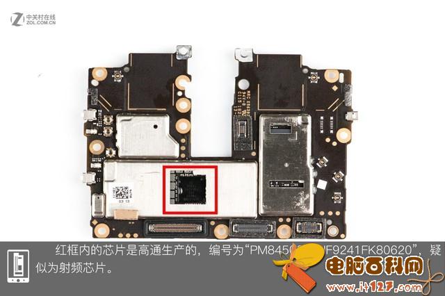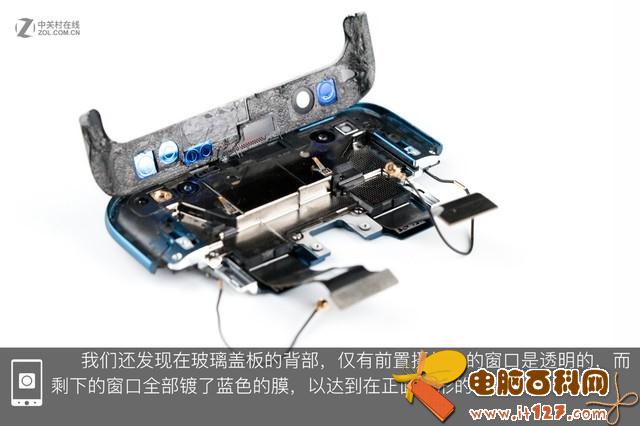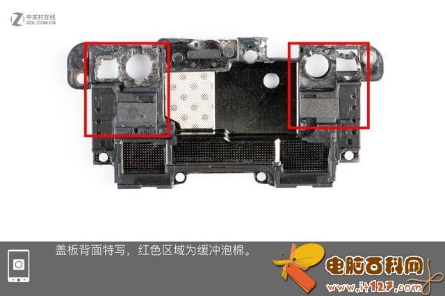 在玻璃后壳内部可以看出,底部和左侧边以及红框内点胶区域构成了一个闭环,可以保护内部元件。但在红框内双面胶区域的两侧,胶要少一些。随后我们会分析下这这片区域的防护。此外,我们可以看到背壳上有两大块泡棉用于缓存。