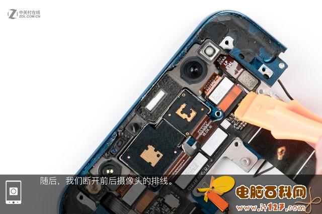 然后我们再次发现,即便是划开了背面三面的胶,依然没有办法将之与机身分离。于是厂商用塑料撬棒往你挑。果不其然,在双轨潜望结构下方,即共色区域内还有大量胶用来固定后壳,于是还需要将这部分胶挑开。